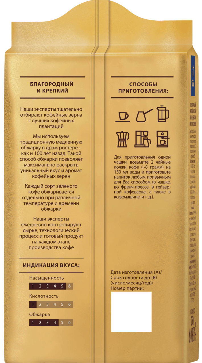 Зерна тщательно обжариваются небольшими партиями до благородного золотисто-коричневого оттенка. Эта особая золотистая обжарка позволяет раскрыть необычайно богатый вкус и насыщенный аромат кофейных зерен.
